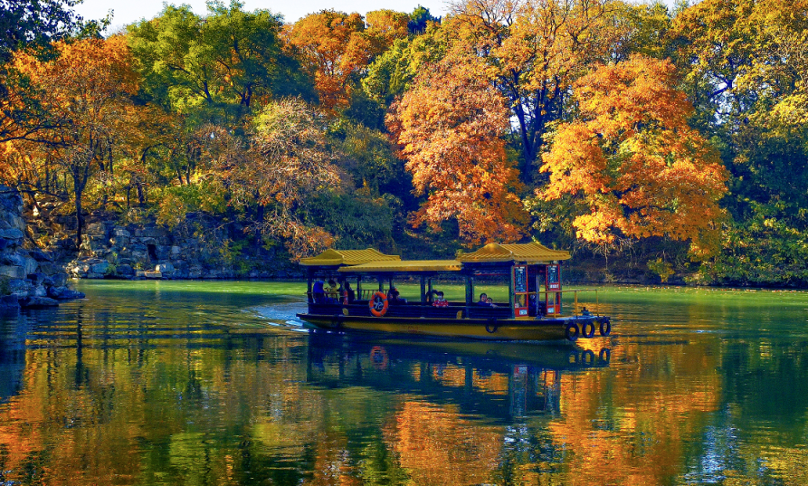 两岸的大乔木在深秋在秋日暖阳下呈现出热烈且纷繁的色彩,与远处的西山形成大山大景的园林意境。这背后隐藏着园林技师的景观审美与精心养护。