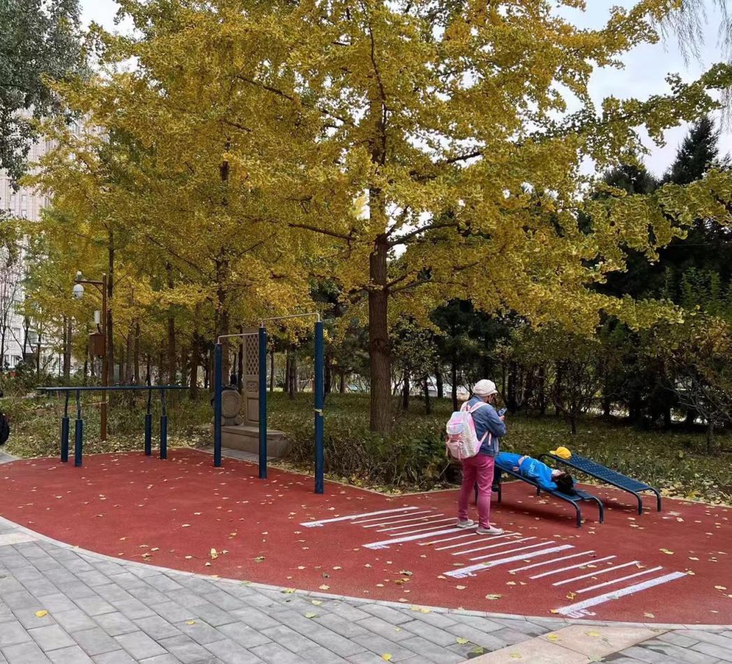 穿过北园向西行,重装亮相的松林里公园俨然一个运动乐园。松林里公园占地面积1.7万平方米,与二环人行道串联,形成了一条长约700环形健步路。公园里专门设置了青少年运动场,单杠、双杠、摸高器、仰卧起坐等训练器散布,孩子们可以在这儿开展立定跳远、跳绳、引体向上等体测项目训练。在公园西部,蓝、红、橘等大色块装点着儿童乐园,游戏沙坑、滑梯、涂鸦板等设施,成为小朋友们的最爱。公园西端,还有塑胶广场,康复栏杆、太空漫步机等,对老年人也十分友好。