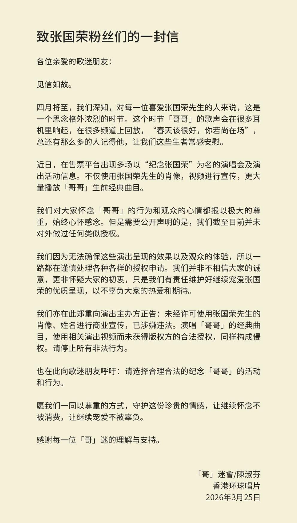 声明中表示,这些以纪念张国荣为名的演出活动,不仅使用张国荣的肖像、视频进行宣传,更大量播放张国荣生前经典曲目。“我们对大家怀念‘哥哥’的行为和观众的心情都报以极大的尊重,始终心怀感念。”但因为无法确保这些演出呈现的效果以及观众的体验,所以一路都在谨慎处理各种各样的授权申请。