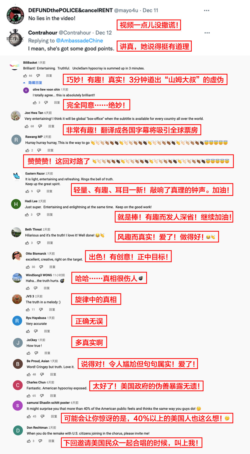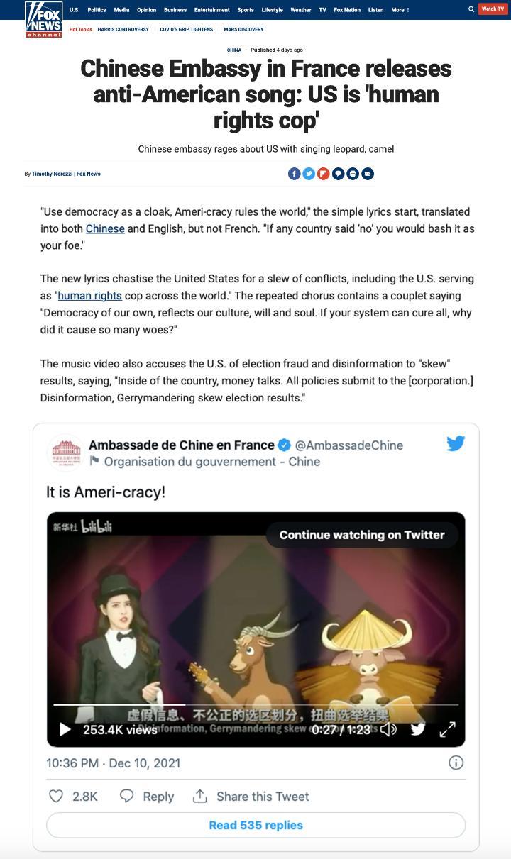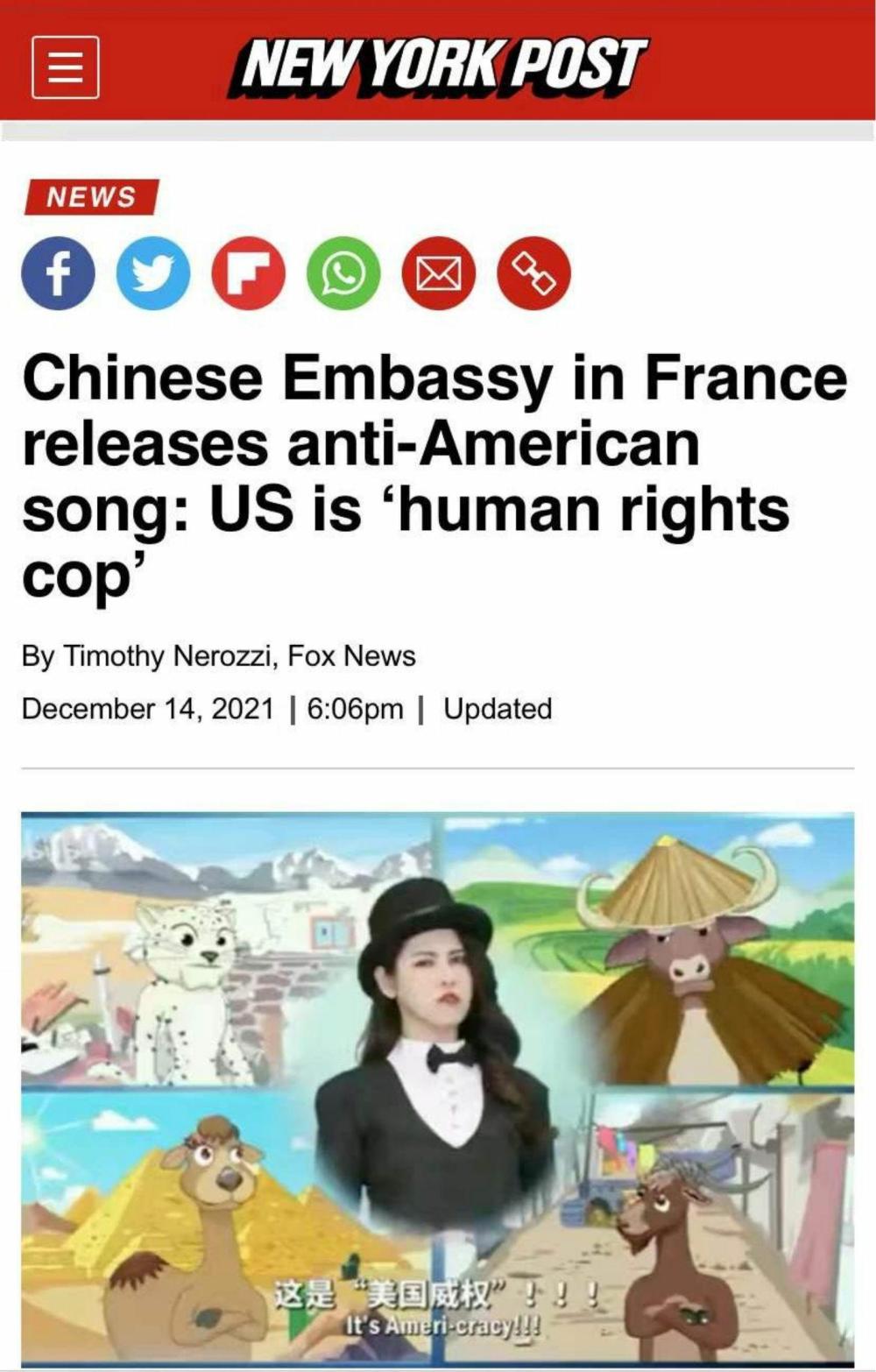 美国福克斯新闻网14日以《中国驻法国大使馆发布批美歌曲:美国是“人权警察”》为题发文,报道了这一“由中国媒体制作,讽刺美国民主的视频”。报道对视频中的歌词逐句解读,称“这些歌词就一系列冲突对美国进行了谴责”,其中包括美国人权问题、选举欺诈行为等。
