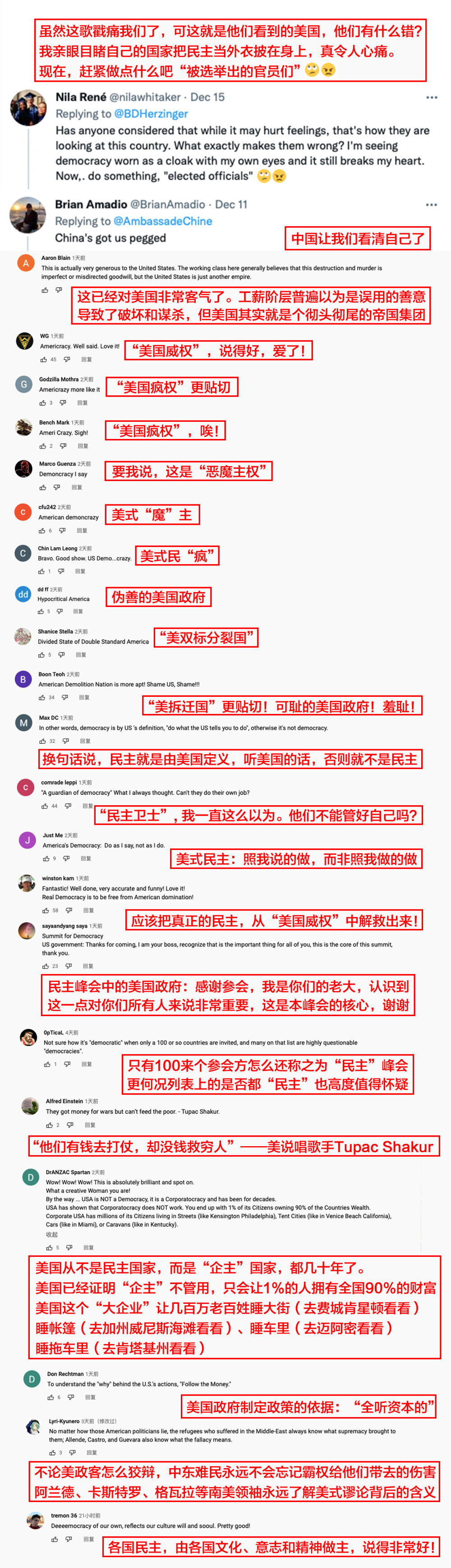 她的节目引发美国网友反思。有美国网友留言:“我亲眼目睹自己的国家将民主当成外衣披在身上,这令我感到心痛。”美国政府用所谓的“民主、自由、人权”等一系列美丽词汇掩盖其虚伪本色,应该反思。