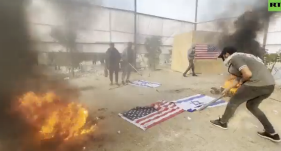 2021年最后一天“美国大使馆”模型被烧后,2022年第一天美国国旗又在伊拉克首都被示威者焚烧。