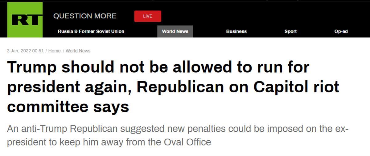 据“今日俄罗斯”(RT)报道,当地时间1月2日,美国众议员莉兹·切尼在接受美国广播公司的采访时表示,不应该允许美国前总统特朗普再次参加总统选举。