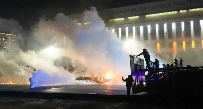 当地时间2022年1月5日,抗议者冲击市政府大楼,警方向抗议者发射催泪瓦斯。