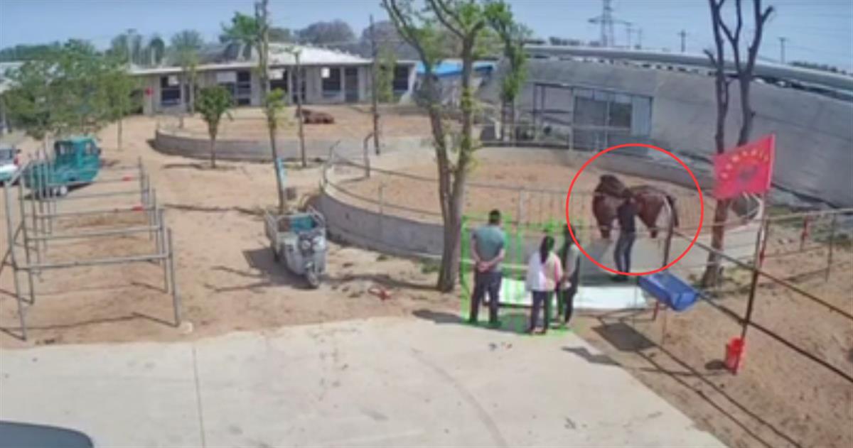 多段网络视频显示,一个马场的马圈外,一名黑衣男子靠近马圈的围栏后,用手摸了圈内一匹马的颈脖处,被摸的马突然转头,咬了男子的左耳,男子用手捂住被咬的耳朵,旁边的人连忙上前查看情况。