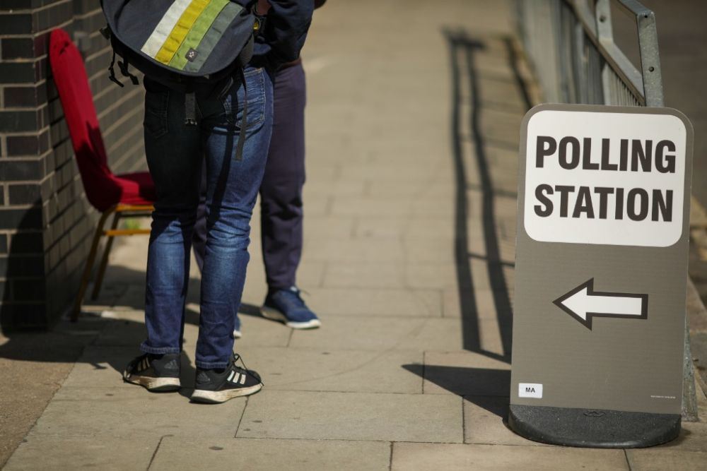 5月5日,人们在英国伦敦一处投票站外等待投票。新华社发(蒂姆·爱尔兰摄)