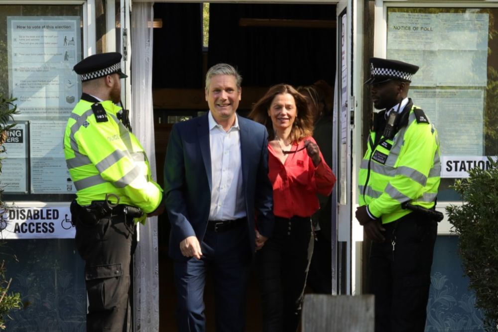 5月5日,英国工党领袖斯塔默(左二)与妻子(右二)在伦敦一家投票站投票后准备离开。新华社发(蒂姆·爱尔兰摄)