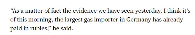 德拉吉说:“根据我们昨天看到的一些证据材料,我认为是在今天(11日)早上,德国最大的天然气进口商已经使用卢布支付了俄罗斯天然气。”