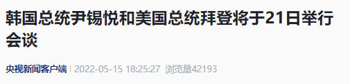 据韩联社报道,韩国总统室相关人士5月15日在记者会上表示,韩国总统尹锡悦和美国总统拜登将于5月21日举行首次会谈。