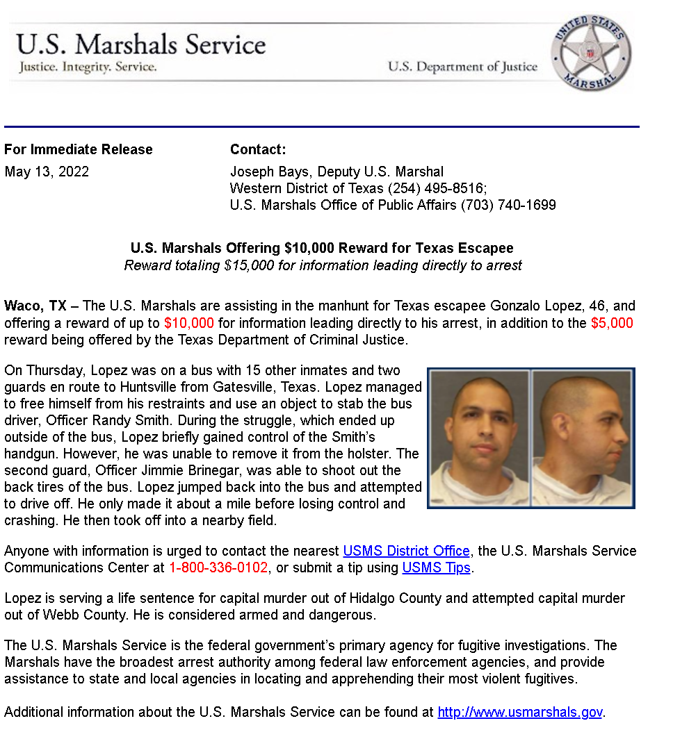 根据美国媒体的最新报道,截至当地时间周六,包括FBI在内的美国执法部门已经出动超300人搜捕这个逃犯。美国联邦法警部门和得克萨斯州刑事司法部更是开出了总共2.25万美元(约合人民币15万)的赏金悬赏他。