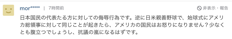 关于此事,虽然纽约大都市队进行了道歉,但有不少日本网民并不买账。对于FNN17日的报道,有不少人评论称,“我看了视频,很过分”“这是对代表日本国民的人的侮辱”“如果对换位置,美国会怎么想?”等等。有日本网民称,“我是‘亲美派’,也是喜欢大联盟的棒球迷,但仍认为这是不能被允许的事。(美国球队)完全是故意这么做,或是在轻视日本人。”