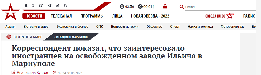 据报道,“星星”电视台记者库斯托夫与一些外国记者一同参观了一个“亚速营”基地和伊里奇冶金厂,并拍下了这段视频。俄罗斯国防部发言人科纳申科夫4月15日宣布,通过进攻行动,伊里奇冶金厂已被俄方“从乌克兰民族主义分子手中完全解放”。此前两天,俄方确认在伊里奇冶金厂地区上千名乌克兰海军陆战队队员投降。