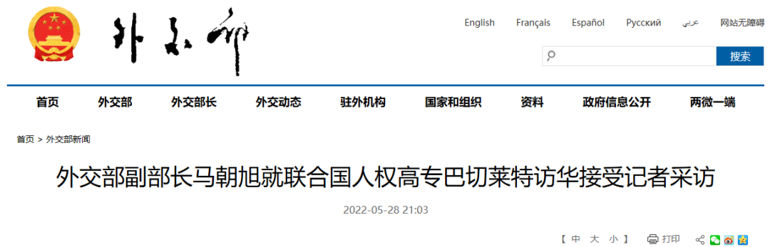 联合国人权事务高级专员巴切莱特于5月下旬访华。2022年5月28日,外交部副部长马朝旭接受记者采访,介绍了中方接待巴切莱特高专访华有关情况。