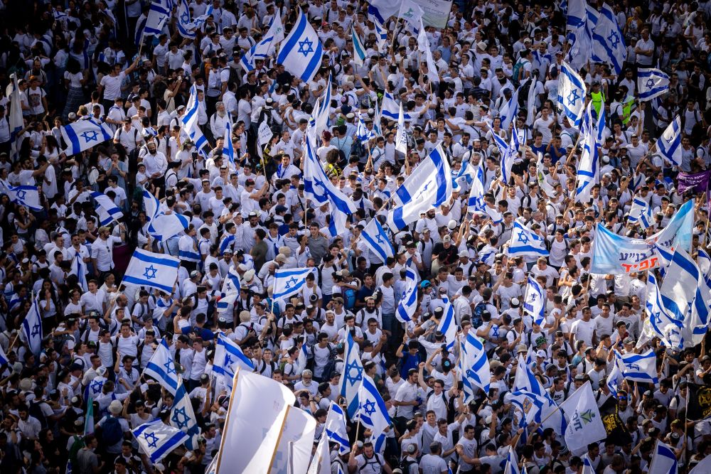 2022年5月29日,以色列民众在耶路撒冷举行“耶路撒冷日”游行。游行引发巴勒斯坦抗议者与以色列军警冲突,造成约200名巴勒斯坦人受伤。新华社/基尼图片社