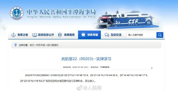 29日,福建平潭海事局发布航行警告,7月30日8时至21时,福建平潭一岐屿附近水域执行实弹射击训练任务,禁止一切船舶进入。广东海事局当天也发布航行警告,7月30日8时至12时,南海大万山岛东南海域将进行军事演习,禁止船舶驶入。