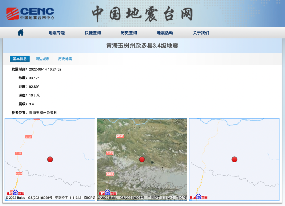 8月14日16时24分,在青海玉树州杂多县(北纬33.17度,东经92.89度)发生3.4级地震,震源深度10千米。