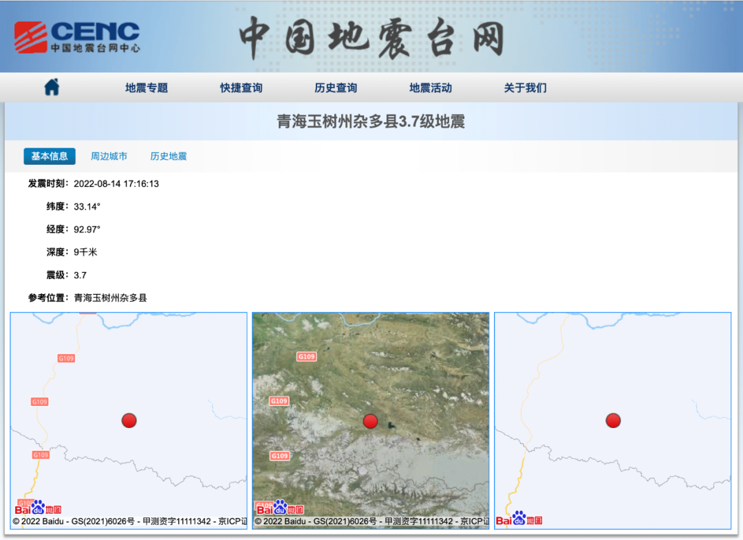 8月14日17时16分,在青海玉树州杂多县(北纬33.14度,东经92.97度)发生3.7级地震,震源深度9千米。