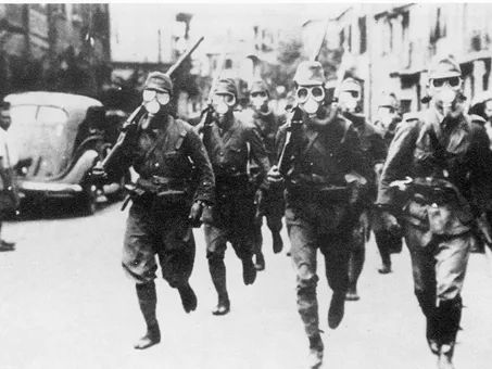 △淞沪会战中穿戴防毒面具的日军(图片来源:黑龙江省社会科学院)