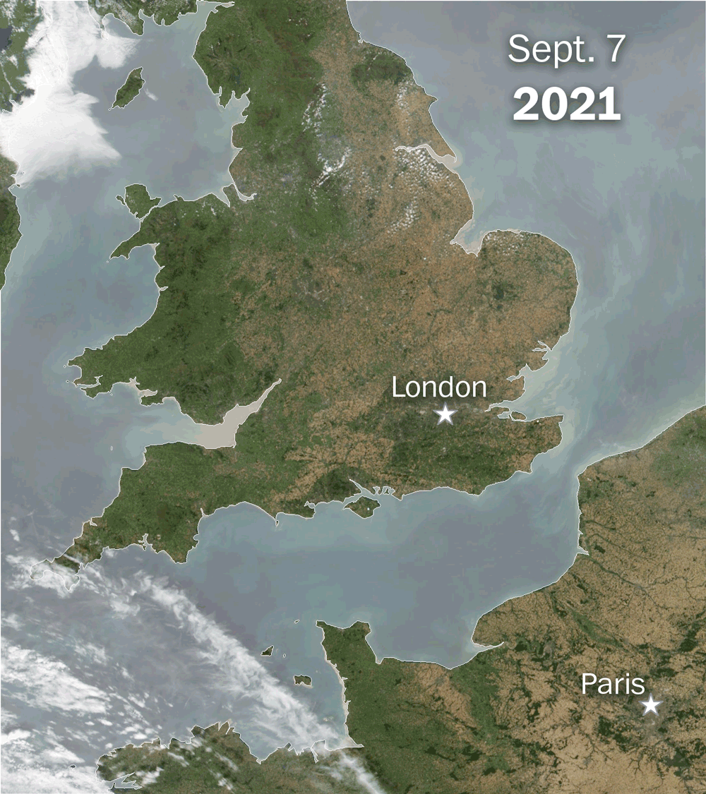卫星图对比一年间英国植皮变化 图源:《华盛顿邮报》