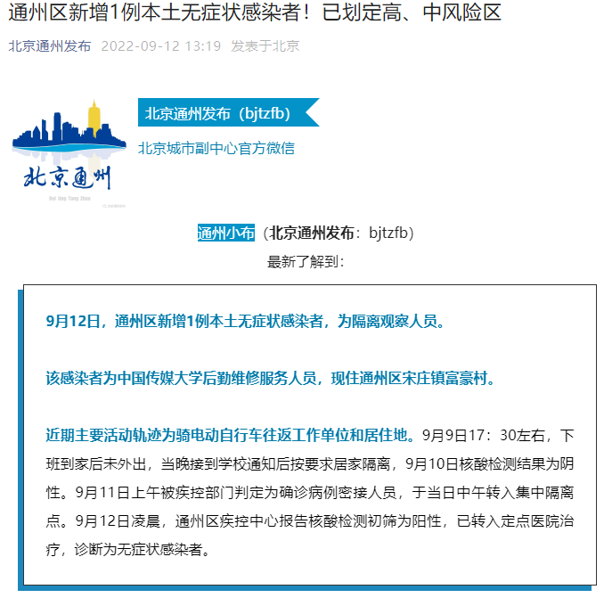 9月12日,通州区新增1例本土无症状感染者,为隔离观察人员。