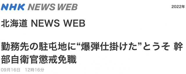 综合日本广播协会(NHK)、《北海道新闻》报道,陆上自卫队北部方面总监部16日对一名50多岁的自卫队官员下达了革职处分。据报道,该自卫队官员2020年曾匿名向所在驻地负责警备工作的人员谎称他“设置了炸弹”。