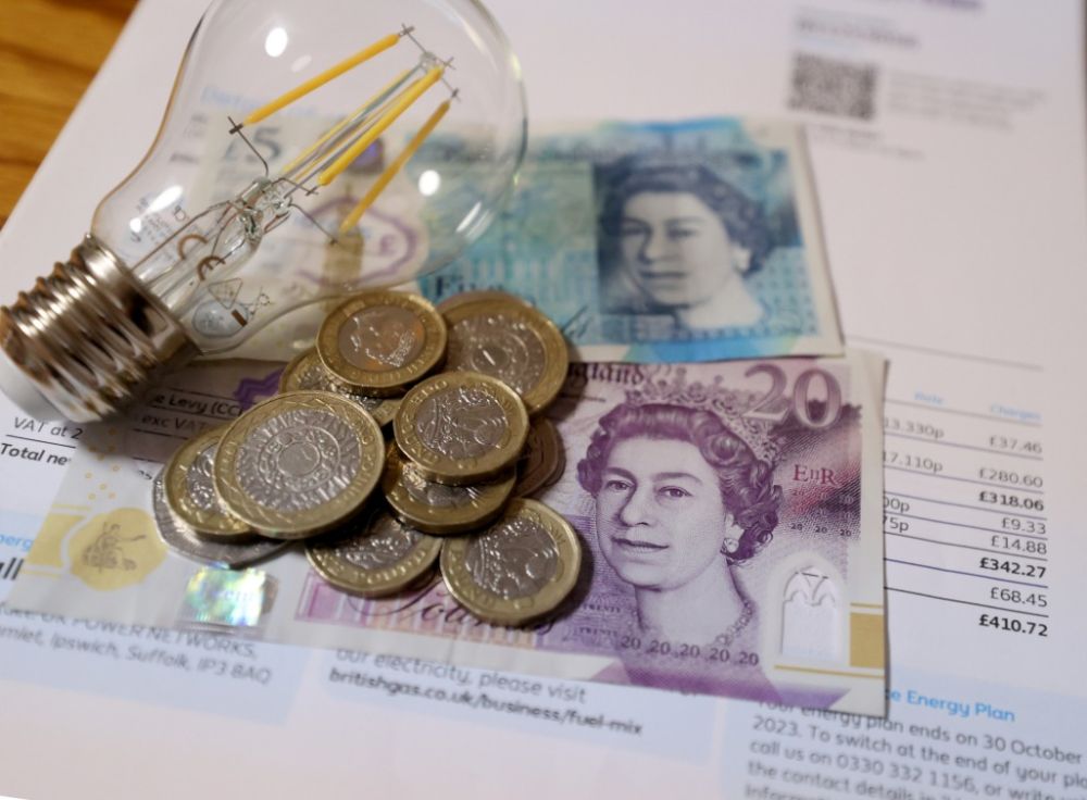 这是10月7日在英国伦敦拍摄的一户人家的电费账单和一些钱币。(新华社记者李颖摄)