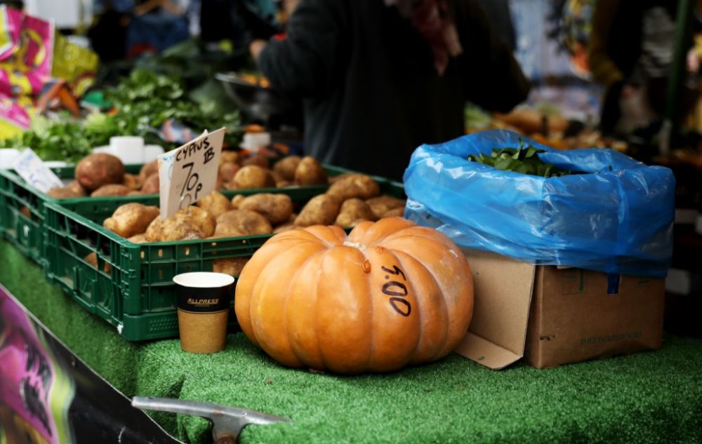 10月22日,一名女子在英国伦敦波托贝洛市场选购蔬果。(新华社记者李颖摄)
