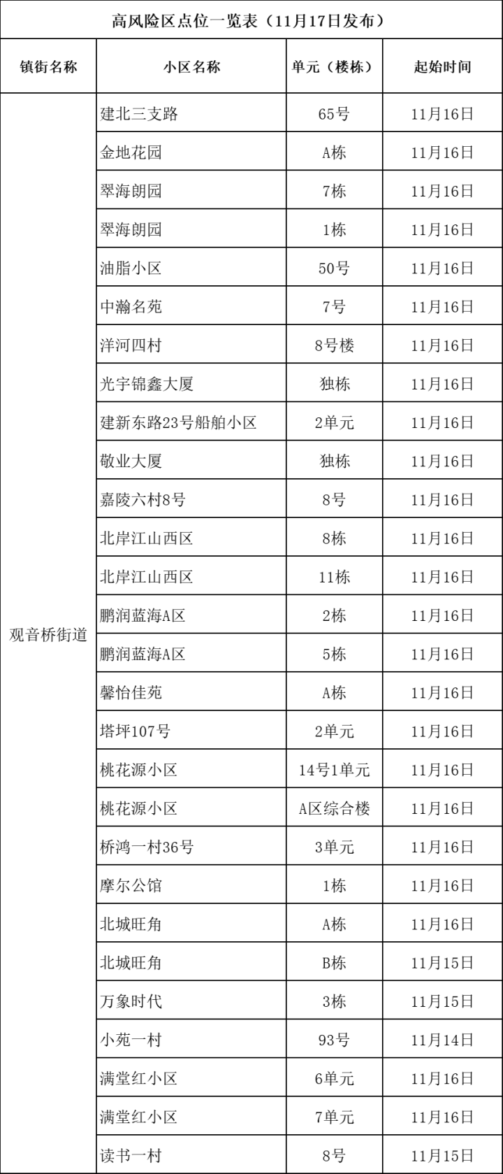 观音桥街道:建北三支路65号、金地花园A栋、翠海朗园(1栋、7栋)、油脂小区50号、中瀚名苑7号、洋河四村8号楼、光宇锦鑫大厦、船舶小区2单元、敬业大厦、嘉陵六村8号、北岸江山西区(8栋、11栋)、鹏润蓝海A区(2栋、5栋)、馨怡佳苑A栋、塔坪107号2单元、桃花源(14栋1单元、A区综合楼)、桥鸿一村36号3单元、摩尔公馆1栋、北城旺角(A栋、B栋)、万象时代3栋、小苑一村93号、满堂红小区(6单元、7单元)、读书一村8号。