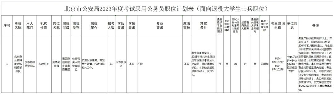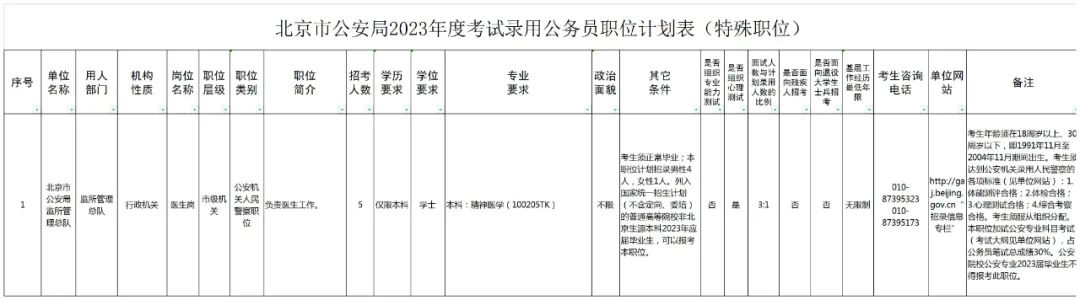 此次招录共设置33个职位,计划招录1050人。各职位具体招录人数及报考条件,点击文末阅读原文,见附件5《北京市公安局2023年度考试录用公务员职位计划表》。