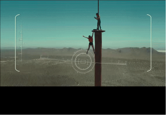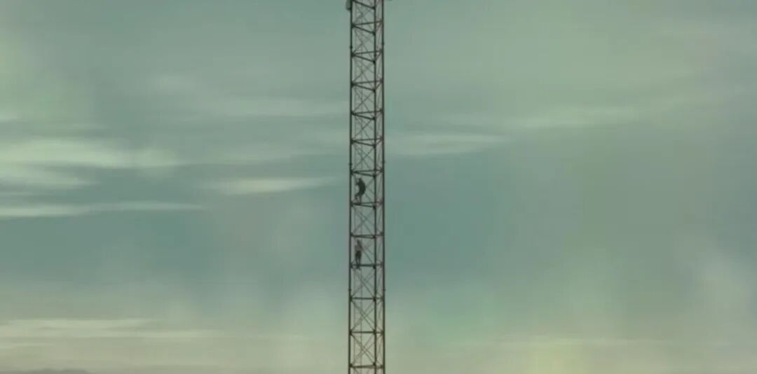 故事就发生在这座电视塔上。在影片前38分钟,电影就暗示了这趟极限冒险之旅的危险性,这也是好莱坞此类电影最常用的手法。当两人晚上坐在一家餐厅吃饭,贝基问服务员要地图,服务员指着窗外说就在那里,只见远处黑暗中电视塔顶部红色信号灯在闪烁,提示着这是一个危险禁区。