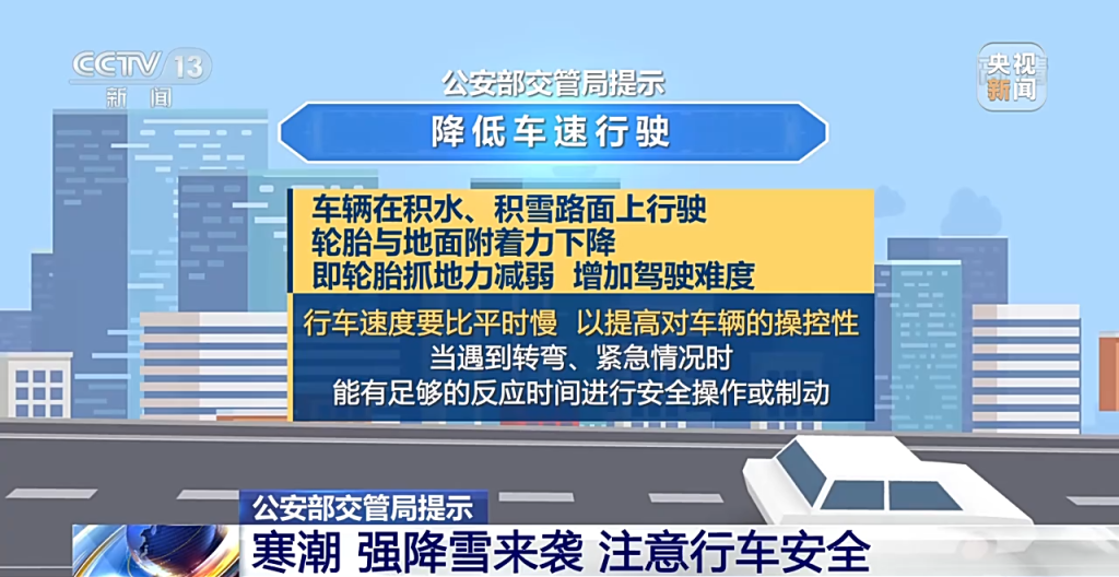 公安部交管局提示:遇降雪天气行车要牢记“降速、控距、亮尾”,打开雾灯、示廓灯、危险报警闪光灯,保持与横向、纵向车辆的安全距离。要尽量避免变道行驶、强超强会、急刹急转,以防发生危险。