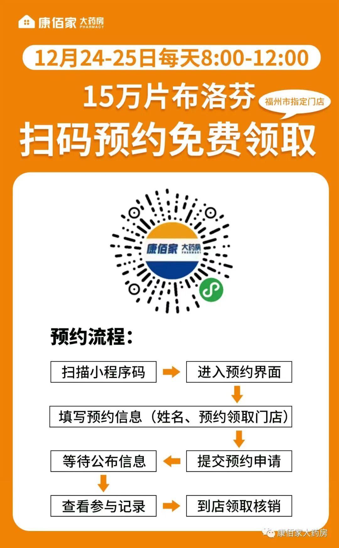 记者也同步了解到,在福州市监管部门的指导下,12月24日—25日,康佰家大药房15万片布洛芬也将在福州13个地区40家店免费发放(后附门店图片),预计惠及2.5万人,市民扫二维码即可预约到店领取。