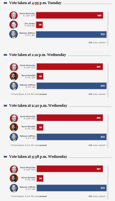 美国新一任国会众议长第三到六轮投票,麦卡锡票数不增反减。图片来源:“今日美国”网站报道截图