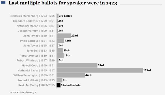 不过,尴尬的不光是麦卡锡,美国政治史上屡有类似“传统”。南北战争前,美国就有三次未能让众议长一锤定音,有次甚至耗时两个月,举行高达133次投票才尘埃落定。1923年,美国众议长也投了9轮票才选出来。