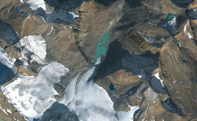 2022年10月13日,加拿大阿尔伯塔省佩托冰川的特写卫星图像。
