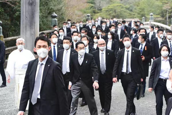 日媒称,日本首相岸田文雄4日参拜伊势神宫,周围有多名警备人员保护。