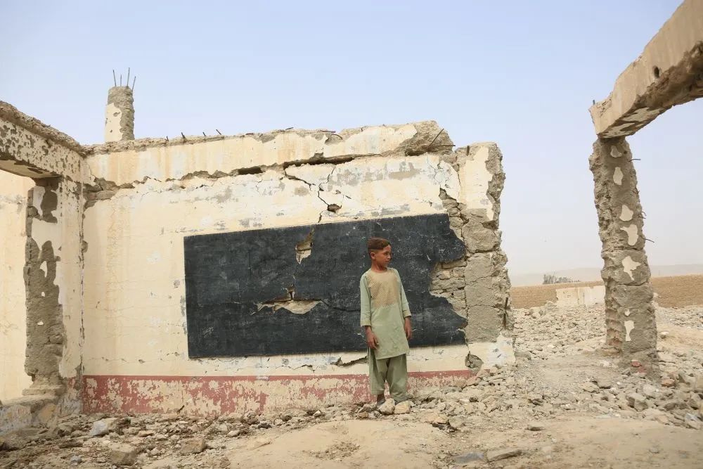 2021年8月23日,在阿富汗南部赫尔曼德省桑金地区,一名男孩站在废墟之中。桑金地区曾经最繁华的市场,如今遍布美军空袭留下的一个个巨大弹坑。新华社发(塞夫拉赫曼·萨菲 摄)