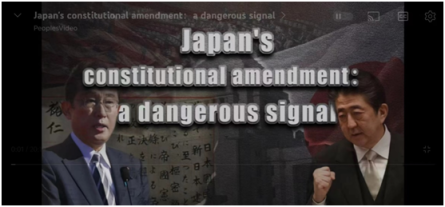 纪录短片《日本修宪:危险的信号》介绍称,政治右倾化是战后日本政治演变的总趋势和鲜明特征,主张修宪的新老保守势力均以重建经济大国、政治大国、军事大国三位一体的所谓“正常国家”为目标。在日本保守势力数十年的宣传攻势下,日本国内主张修宪的力量不断增强,已经产生了修改和平宪法的社会氛围。日本保守势力多年来大力推动修宪进程,核心诉求就是要修改宪法第九条。该视频日前在互联网上发布受到广泛关注。