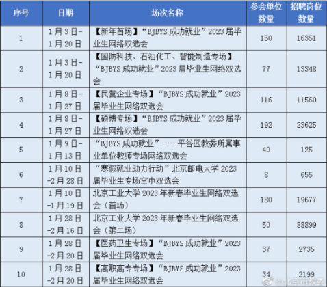 新春新气象,就业启新程!2023年新年伊始,北京市教委所属北京高校大学生就业创业指导中心将在北京高校大学生就业创业信息网(http://t.cn/A6X8okI6)结合新春及寒假工作特点,陆续举办10场线上双选会,覆盖国防科技、石油化工、智能制造、医药卫生等多领域多行业。正在找工作的同学千万别错过——