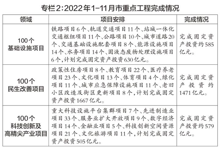 有效投资关键作用充分发挥。坚持“四抓”工作路径,1-11月固定资产投资增长3.2%。按季压茬推动160个市区重大项目开工建设,180项市重点工程续建项目实现投资1169.9亿元,制定加快推进现代化基础设施体系建设实施方案,重大项目储备总体实现“开一备三”。强化要素保障,完成四批次集中供地,发行地方政府专项债券资金789亿元。出台政府投资管理办法及细则,项目科学决策与成本管控水平持续提升。向民间资本公开推介项目256个、总投资3549亿元,均为五年来最高水平。累计上市基础设施领域不动产投资信托基金项目5个、募集资金131.6亿元,发行上市数量和募集资金规模保持全国首位。投资“有效性”更加突出,高技术制造业、高技术服务业投资分别增长26.6%、58.5%。