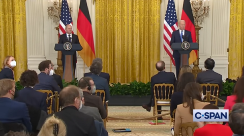 接下来发生的事情令人震惊。2月7日,距离俄罗斯貌似必然会攻打乌克兰的前三周,拜登在白宫办公室会见了德国总理奥拉夫•朔尔茨。在经过一番摇摆不定后,朔尔茨坚定地加入了美国一边。在随后的新闻发布会上,拜登挑衅地说,“如果俄罗斯发起战争 . . . 北溪2号将不再存在。我们将了结这条管道。”