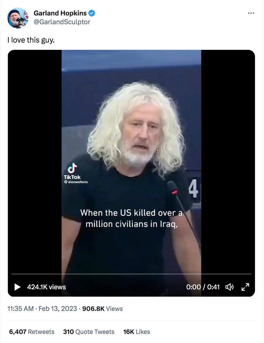 近日,华莱士一则去年发言视频也在社交媒体上“翻红”。去年10月,在法国斯特拉斯堡举行的会议上,华莱士发言时怒喝:“美国在伊拉克杀害上百万平民,这不是恐怖主义吗?”他还对西方领导人喊话:“你们什么时候才愿意醒过来,开始活在真实世界里?”