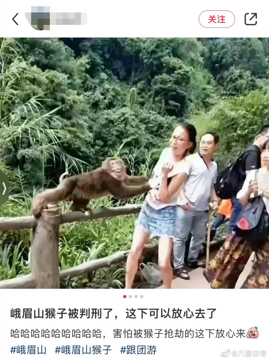 此外还有一张配有“峨眉山猴子被判刑了,这下可以放心去了”的文字。