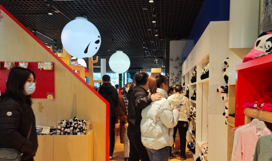 火爆的人流也带火了大熊猫馆的文创产品,文创店中也是人流如织,各种大熊猫图案的毛绒玩具、钥匙扣、冰箱贴、帽子、马甲等文创产品个个憨态可掬,呆萌可爱,吸引了很多游客选购。
