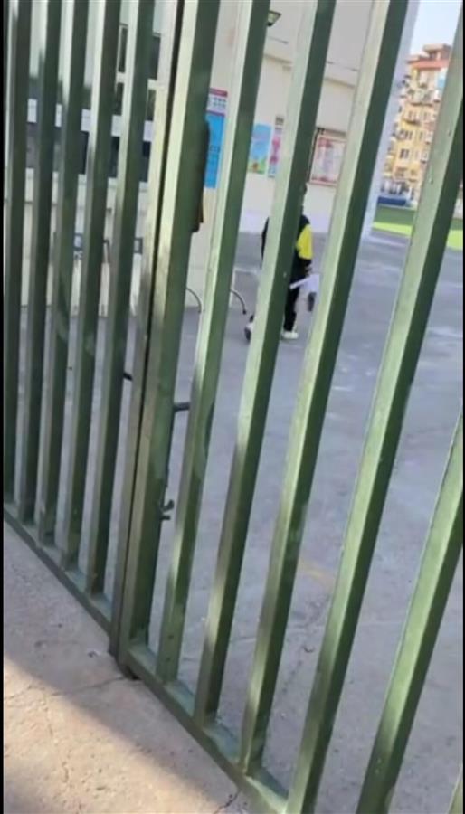 视频中,在一个栅栏式大门口,有一个小男孩从栅栏处接过外卖骑手递进去的疑似奶茶的外卖,然后转身往里走。视频显示的地址,为大连市沙河口区华北路小学。