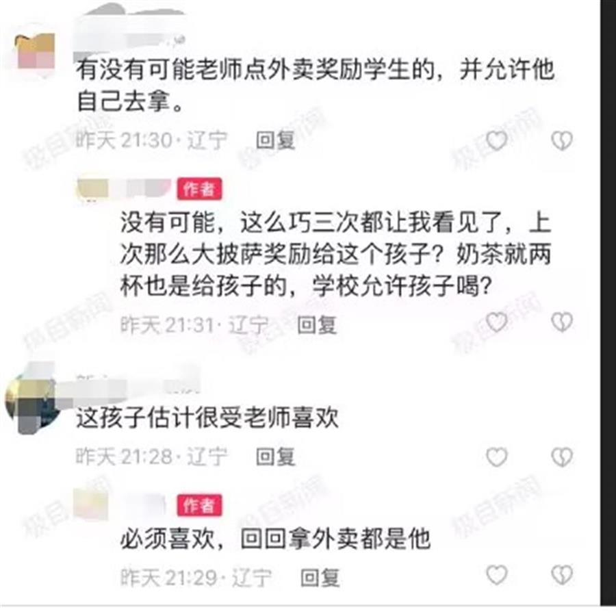 有网友称,有没有可能老师点外卖奖励学生的,并允许他自己去拿。视频发布者回复称,没有可能,已经不是第一次看见这个学生在门口拿外卖,上次的外卖是披萨,这次是两杯奶茶。