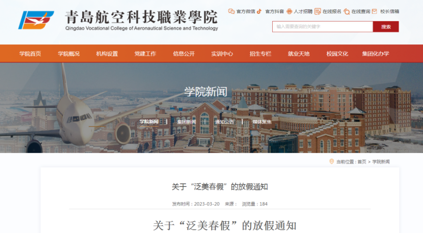 与青岛航空科技职业学院同属泛美教育集团旗下的四川西南航空职业学院、绵阳飞行职业学院等院校通知,也从4月1日至7日放7天“春假”。