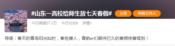 3月21日,青岛航空科技职业学院在多平台发布通知,将于4月1日到7日(含清明放假时间)安排全校师生放七天春假。#山东一高校给师生放七天春假#话题引发热议。