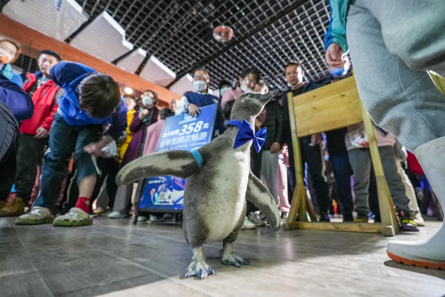 3月26日,在北京太平洋海底世界博览馆,6只今年诞生的洪氏环企鹅宝宝首次与游客见面。今年初,6只自然孵化的洪氏环企鹅破壳诞生,历经90多天的育幼期,它们褪去稚嫩的羽翼,今天起由饲养员抱进企鹅馆,与它们的亲生企鹅爸妈和兄弟姐妹一起生活,博览馆专门为萌萌的小企鹅举办游客见面会。