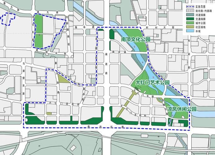 南中轴地区建设办公室日前公示了《北京丰台大红门博物馆群及周边地区规划综合实施方案(一期)(草案)》,大红门地区将打造无界共享的博物馆群,并建设大红门艺术公园、南顶文化公园、凉凤休闲公园三大公园。